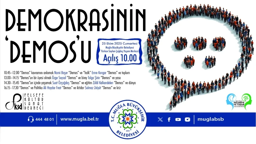 Muğla Büyükşehir Belediyesi, Felsefe Kültür Sanat Derneği ve Muğla Felsefe ve Yaşam Akademisi, demokrasiyi tarihsel ve felsefi yönleriyle tartışmaya açacak bir sempozyum düzenliyor. “Demokrasinin ‘Demos’u, Antik Çağ’dan Bugüne Gelen Bir Kavramın Çok Boyutlu Analizi” başlıklı etkinlik, 25 Ekim 2025 Cumartesi günü Türkan Saylan Çağdaş Yaşam Merkezinde saat 10.45’te başlayacak.